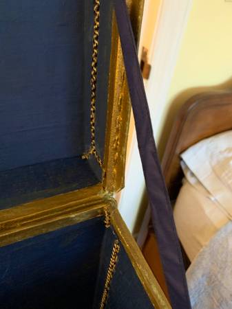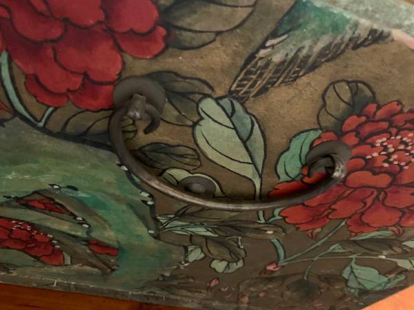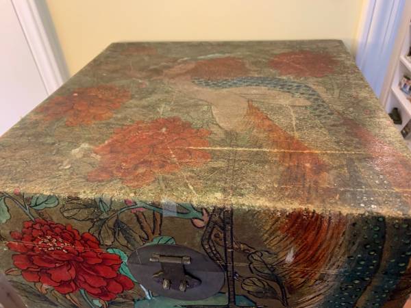 Vintage Painted Wood and Paper Mache Box From Shanghai. Blue Felt Lined. Handles on the sides. 18”square x 16/5”h. Smoke free household. Location: Short Hills