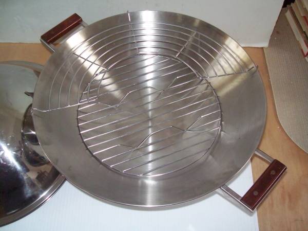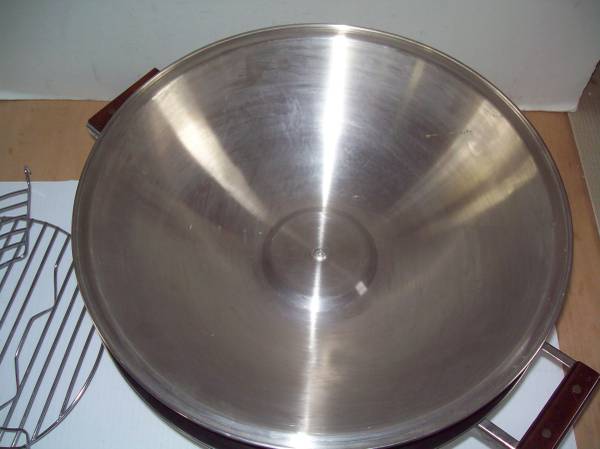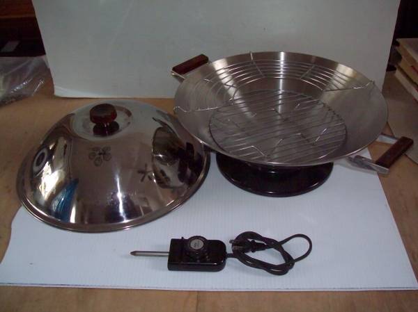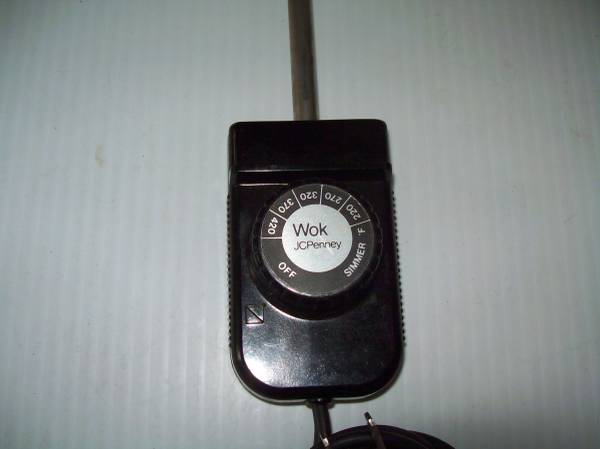 I'm selling a vintage JC Penney Electric Wok in excellent condition. The detachable control has settings from simmer to 420 degrees. The cord is 29" in length. It's 14-1/4" across at the top of the wok. The lid handle and side handles are stained wood (!). The base is plastic. JC Penney no. 784-401; catalog no. 784-4830 (which puts this pre-2011), 120 VAC, 1100 Watts, made in Hong Kong. Included are two racks. This heats up FAST. If you're looking for an inexpensive electric wok you've found one here. If the listing is up it's available so don't ask. It's located in Vernon, New Jersey, minutes from the high school and 3.7 miles in from the border with New York State at Pine Island, New York. CASH payment on pick up.