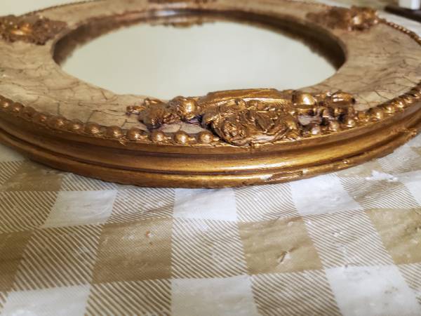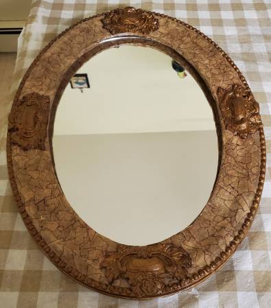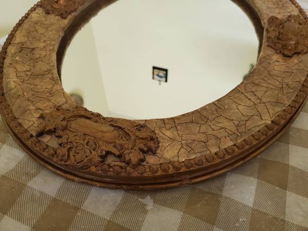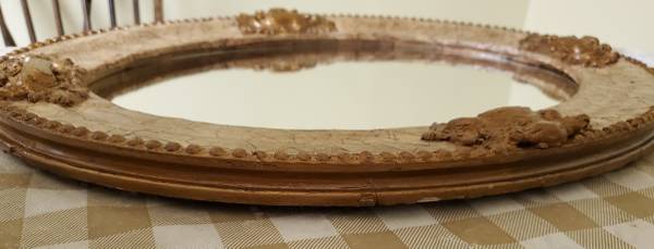 Antique oval wall mirror with carved wooden frame. Dimensions: 2" thick x 18 1/2" wide x 24 1/2" tall If interested, please respond with a phone number. Price is firm $80.00