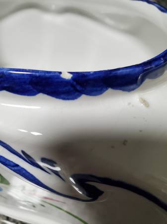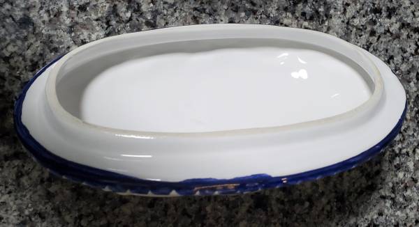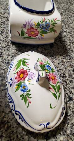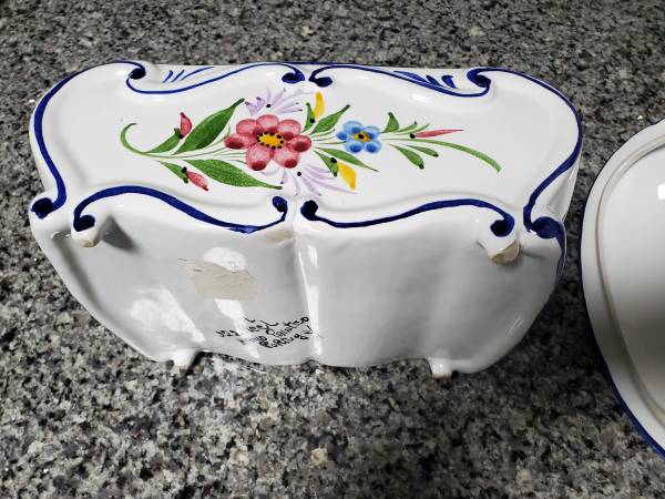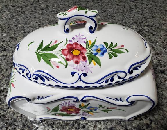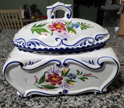 Vintage 222 Reel Hand Painted Ceramic Porcelain Art Pottery Tureen Hand painted Portugal Size: 10" long x 6" wide x 8" tall Has a very small chip on top edge as seen in last picture, otherwise it's...