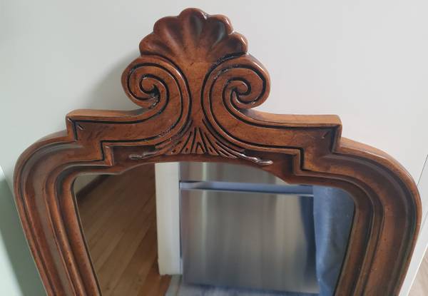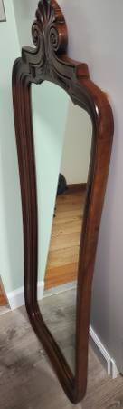 Vintage walnut framed wall mirror with hand carved shell crest. Frame size is 20" wide x 51" tall If interested, please respond with a phone number. Price is firm $140.00