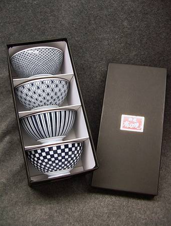 New in gift box SAKAI Egawari set of 4 blue and white rice bowls. Made in Japan. Dimensions: 4 1/2 inches in Diameter $15.00 Cash Available for pickup only. virtual estate garage yard sale bowl...