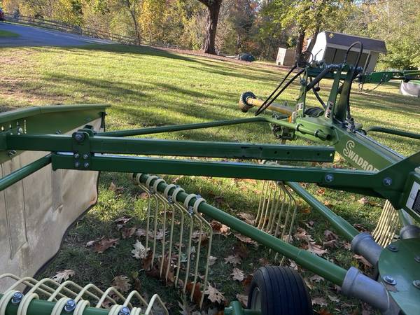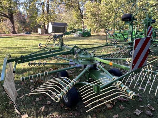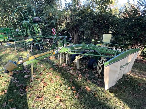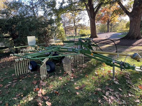 The Krone SW 38 T trailed single rotor rake has a transport width of approximately 6’3”. Its working width is 12’6”, and the rotor diameter is 9’9”