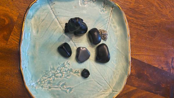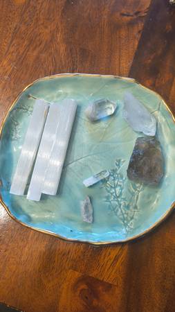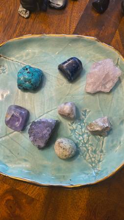 The picture with a bunch of crystals and stones I am selling that together sodalite (blue with white), malachite (green banded), carnelian (orange-red), rose quartz (pink), amethyst (purple), black tourmaline or black obsidian (black), yellow jasper or citrine (yellow), and what looks like Dalmatian jasper (tan with black spots). - $10 all together