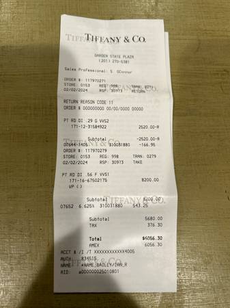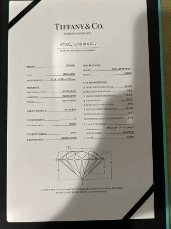 A beautiful AUTHENTIC Tiffany Solitaire engagement ring. Brand New. Unfortunately, plans did not work out. So her loss is your gain. Serial number blurred for security purposes. Paid over 8k! Please ask any questions and do NOT waste my time trying to scam me. It will not work. Cash ONLY, and authenticity will be verified at a Tiffany location. Thank you for looking.