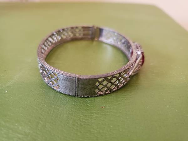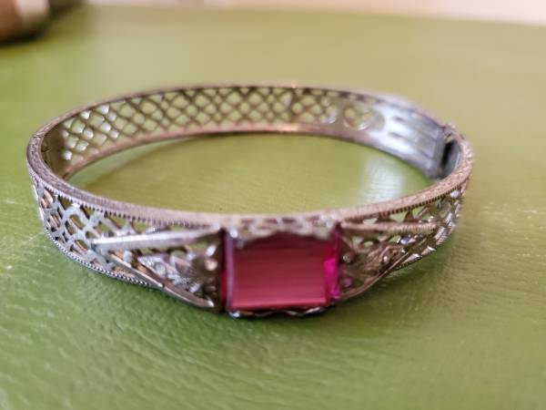Vintage 1920 - 30's Art Deco Style - STERLING Filigree Bracelet with Purple Glass Stone - Hinged Clamper Bangle Bracelet - Only Marking is "STERLING"