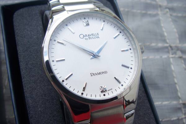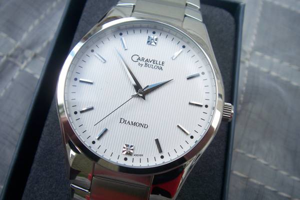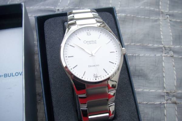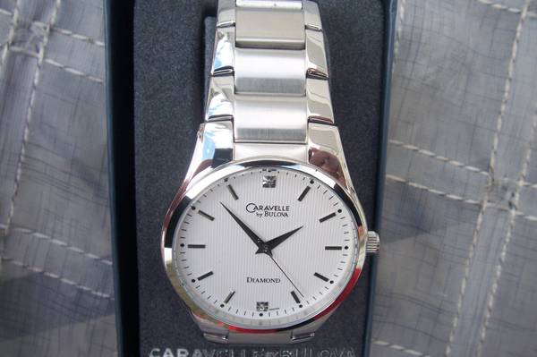 New in Box with Papers! Men's Bulova Caravelle Genuine Diamond Modern Textured White Pinstripe Dial Bracelet Watch. See photos. Serious only. If the ad is up the watch is available. Cash only. Pick...