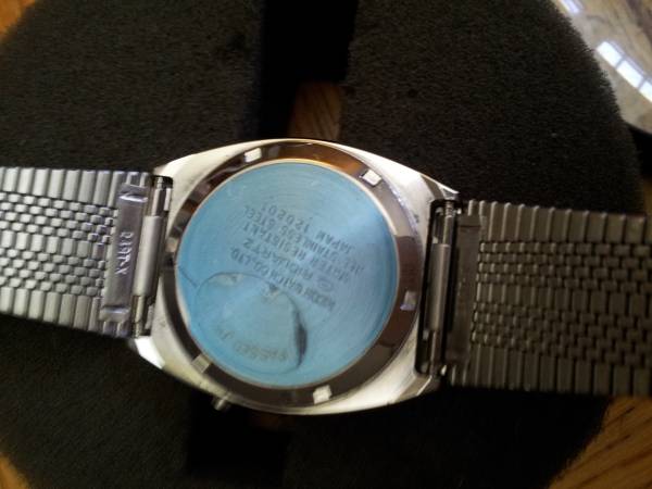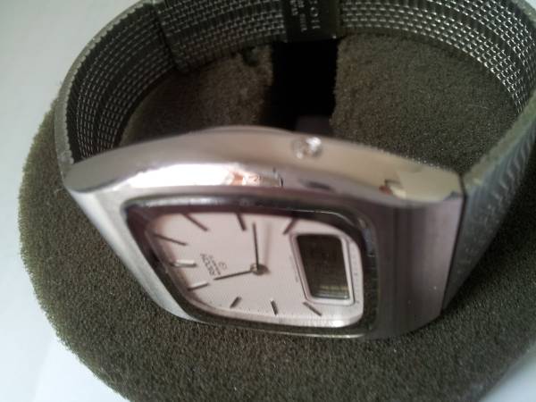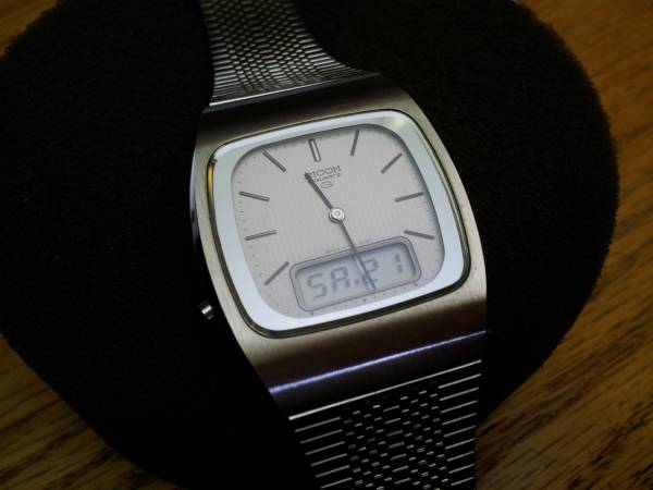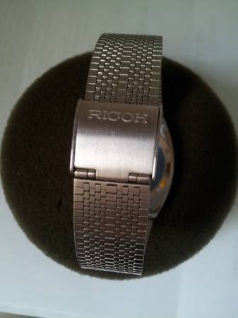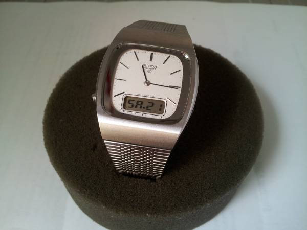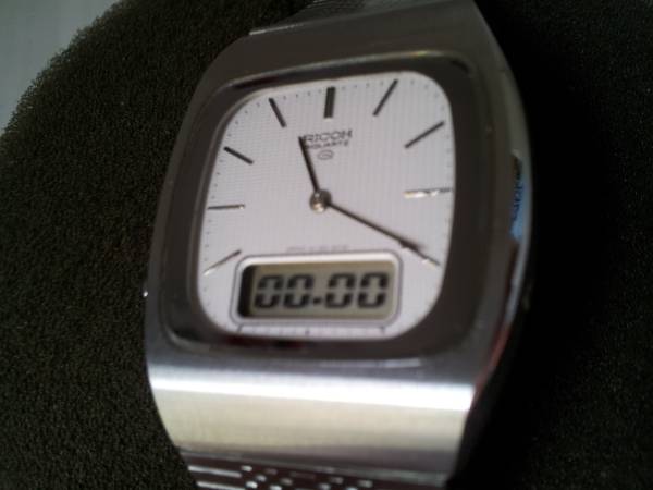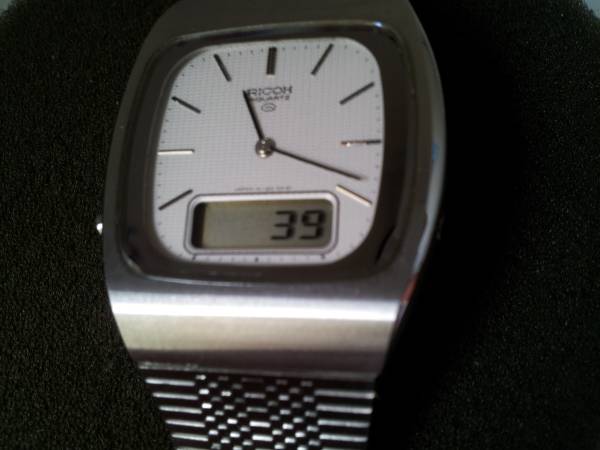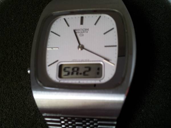Very Rare Mens Original Vintage 1980s Ricoh Riquartz Analog & Digital Dual Time Day Date Jump Minute Chronograph Slim Stainless Steel Executive Bracelet Watch. Made in Japan. The watch features a gorgeous White Textured Dial and perfectly integrated Ricoh Stainless Steel Band! The watch is in NOS and new never worn condition with factory plastic on case back and all functions operate perfectly. It is an extremely rare, astonishingly clean and well preserved timepiece. Serious Collectors Only. Demo Video Available! Respond with phone # and I will call you to set up a time to come see it. Cash only. Pick up only in Guttenberg, NJ. Thanks for your time and interest!