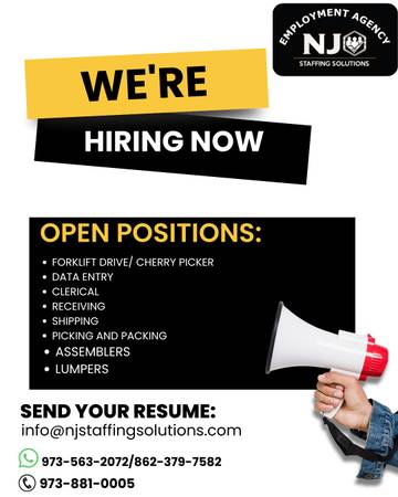 Picking Packing, Forklift, Clerical, Lumpers, and Data Entry positions available through New Jersey Staffing Solutions