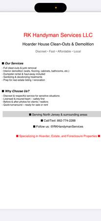 RK Handyman Services LLC Hoarder House Clean-Outs & Demolition Discreet • Fast • Affordable • Local ■ Our Services - Full clean-outs & junk removal - Interior demolition (walls, flooring,...
