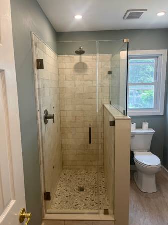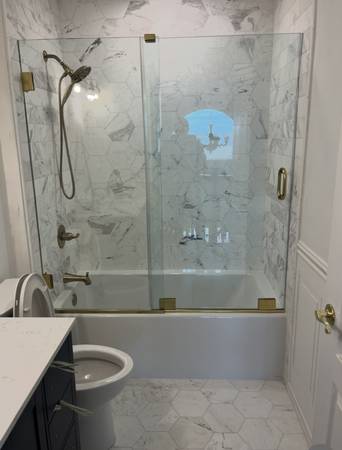 Shower enclosure fits 50" to 70" In width and up to 78" in hight or less. 3/8" clear tempered glass with your choice of hardware finis. Matt black, chrome, satin brass, brushed nickel. 100 % frameless. Installed price:$1,500.00 1week turnaround. Licensed & Insured