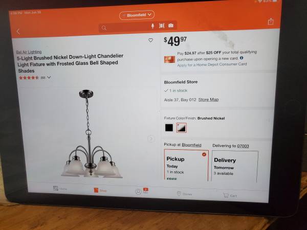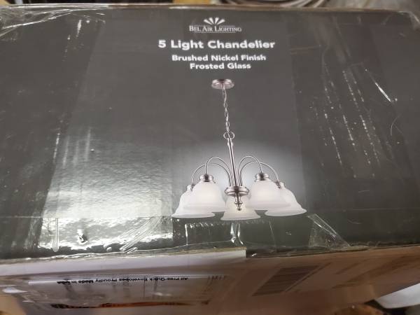This transitional chandelier light fixture from Bel Air Lighting is designed to update your living spaces and coordinate seamlessly with a variety of existing home decor styles. The single-tier chandelier combines a classic brushed nickel finish with sophisticated frosted glass shades. Each of the bell-shaped shades is open at the bottom to allow easy access to change the light bulb inside when needed. The fixture uses 5 light bulbs, and gives off enough light to use in medium to larger sized rooms. The round shape makes this chandelier perfect for use over a formal dining table, foyer entryway with tall ceilings, or over a kitchen island. A matching chain is included offering an adjustable hanging height and sloped ceiling compatibility.