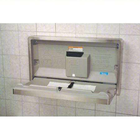 Baby Changing Station is surface mounted to wall, minimizing protruding surfaces in the restroom.