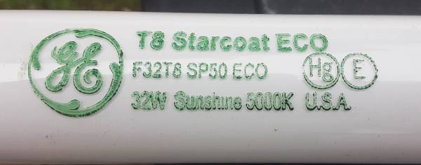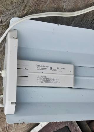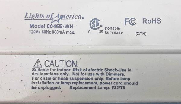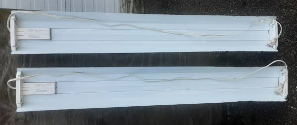Pre-owned & working ... (2) white, overhead-hanging - "Lights of America"... 2-bulb fluorescent-tube fixtures (48") ... plug-in style ... made without lens cover ... sale includes (5) used/working - fluorescent-tube bulbs (F32/T8).