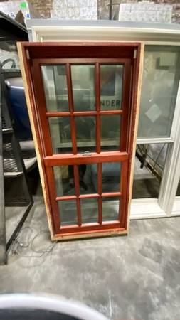 Solid used construction window with divided-light panes. Wood interior, vinyl exterior. Opens and closes smoothly.