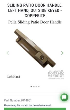 Pella Sliding Patio Door Handleset with Lockset Only This is a discontinued product Fits door manufactured from 1967 thru 1990 Door Operates - Left Hand Which means looking from the outside The left...