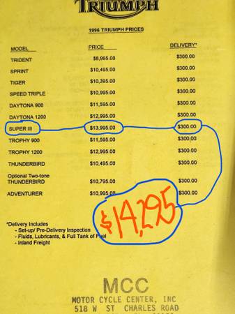 Triumph produced this Super III line of motorcycles for only 3 years...1994/1995/1996. Some 805 in that 3 year-run were built for Worldwide distribution. Just 170-180 of those 805 were sent stateside/USA. Making any of these Daytona/Super III bikes quite rare and highly collectible (especially for a Triumph Collector). The '96 model year was the most exclusive! In fact...in 1996 with an MSRP of $14,295...see last image posted here (including shipping & set-up)...this bike was the MOST EXPENSIVE "3-cylinder" motorcycle in the world! That MSRP would be equal to today's money of over $29,000!