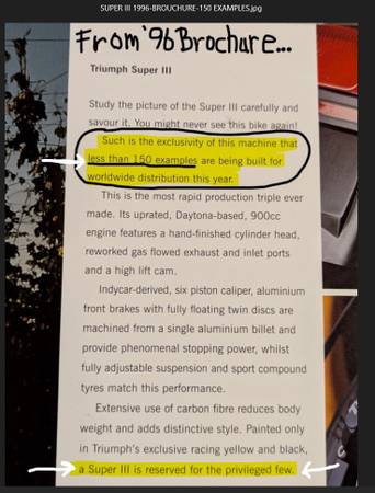 "Such is the exclusivity of this machine that less than 150 examples are being built for worldwide distribution this year. A Super III is reserved for the privileged few." (2nd from last pic is from Triumph's brochure on this '96 Super III).