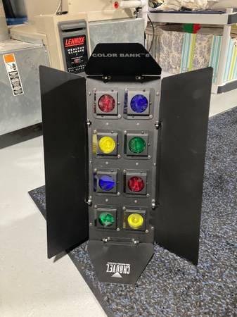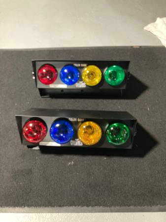 Portable stage lights for sale. Ideal for a small band, a DJ, parties, or events. Easy to carry and set up quickly. Has speed control. A total of 3 separate units, multi-colored lighting. Cash only….