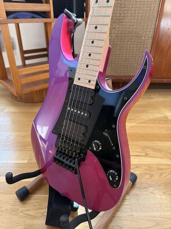 I’m selling my awesome Ibanez RG550 (Genesis Collection) in the eye-catching Purple Neon finish. I’ve put less than 20 hours of playing time on it — bought it new from Sweetwater. Just doesn’t get used enough, so someone else should enjoy it.