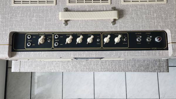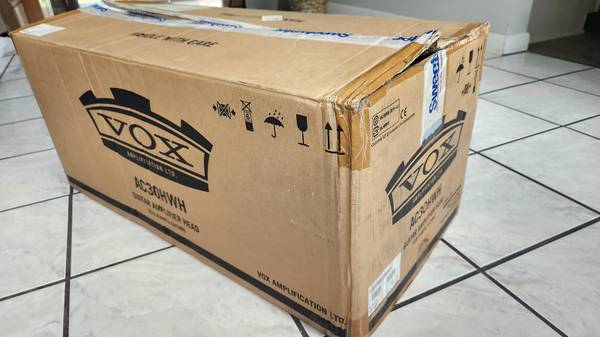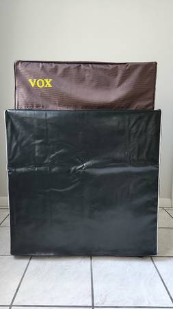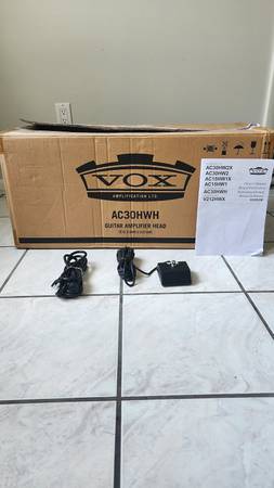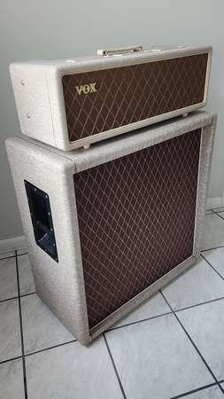 VOX AC30HWHD and custom-made Mojotone British Style 4x12 Straight Cabinet, installed with authentic Vox Brown Diamond Cloth, Vox Fawn style tolex and 4 Celestion Alnico Blue 12” Speakers, wired to a total of 8 ohms with 15W per speaker. Included are the authentic Vox pedal switch, power supply, and covers for both the cabinet and head. Original invoices are also included, as well as the Vox manual. This head and cabinet are practically brand new, they have only been played a total of four times. The grill cloths, piping, and tolex are all in mint condition, no scratches or blemishes. They were stored in a soundproof, air conditioned, dust-free recording studio.