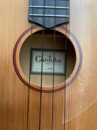Beautiful bariton ukulele made by Cordoba, model 24B with cedar top and spalted back. Very pretty woods with a warm sound typical of cedar tops. Excellent adult-owned condition. Needs new strings and tuning. Comes with Lanikai padded gig bag. Cash only. Pick up only. If you can read this ad, it is still for sale.