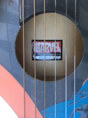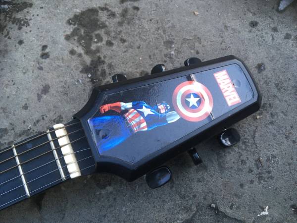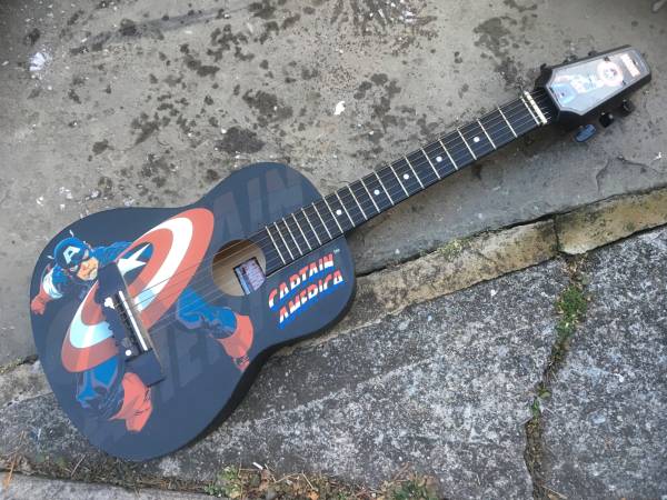 Captain America Marvel acoustic guitar, good condition, plays well, sounds good. Has a plastic safety cap on the headstock to protect youngsters from getting hurt from sharp string ends.