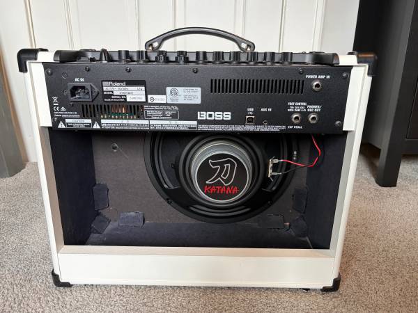 Used, excellent condition. BOSS Katana KTN50 MKII 50W 1x12 Guitar Combo Amp in rare white color. This versatile amp features five amp voicings, onboard effects, and 50 watts of power through a custom 12-inch speaker, delivering powerful tone for practice or performance. It includes support for BOSS Tone Studio software, offering extensive tone customization. Ideal for guitarists seeking reliable performance and tonal flexibility in a compact combo amp package.