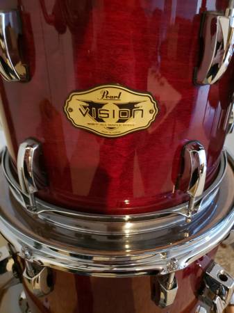 Pearl Vision rare discontinued Rock Maple VLX 3pc Drums these drums sound killer and r stunning Cherrywine Lacquer finish 3 pc drum shell pack in Special order sizes superb build quality. Upgraded with power stroke III kick drum Evans black ported reso kick drum, these drums were climate kept in exc condition. Best Gig sizes 20x18 kick thunderous deep punch best 20' you'll ever kick, 12" rack tom and 14"x14" floor tom sing all in gorgeous Dark Cherry Trans High Gloss Lacquer finish, Evans Black gloss ported resonant with hole protection, omni tom mount and 3 iso shock legs this kit is def pro quality sounds killer stunning good look hardware is rock solid/minty. Price $799. Firm!