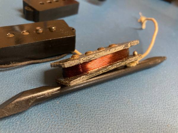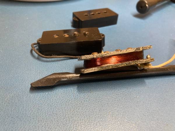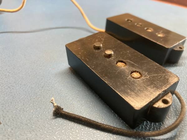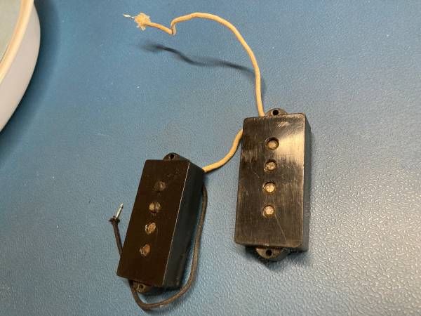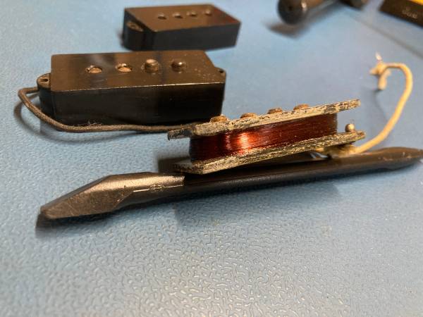 Incredible Vintage Fender Precision Bass Pickup. This would be correct for Fender Precision Basses from 1957-1959. During that time, the pole pieces for the "A" String were raised. Original windings. Original wires. Original covers. Sounds amazing. Very punchy. I'm including 2 shield plates. They are both vintage. One is thinner than the other. One may be from the 50's and one (thicker) may be from the 60's? Not 100% sure, so take both. Feel free to ask any questions or make an offer. Thanks.