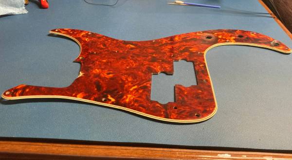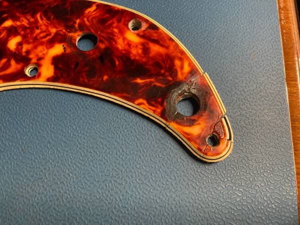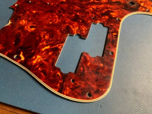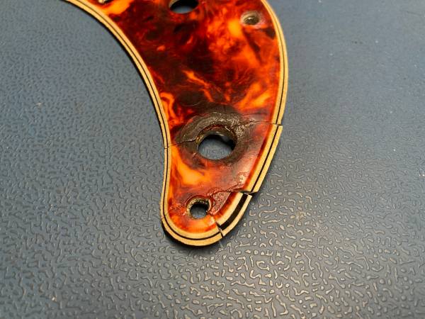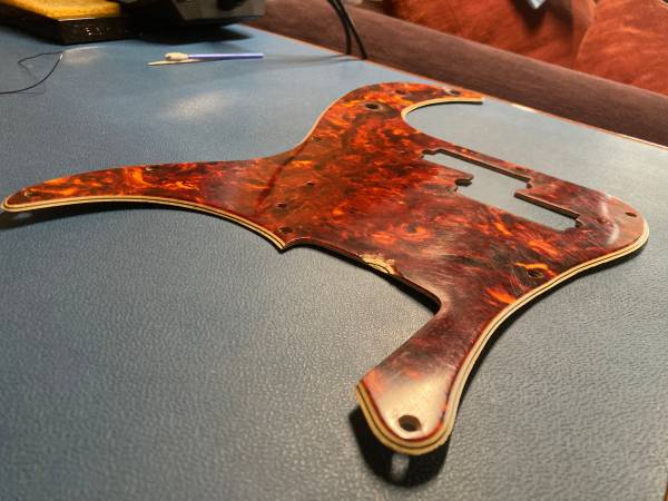 Original Early 60s Fender Precision Bass Celluloid Tortoise Pickguard. Great pepperoni-like pattern. Vivid color. First thing to note is the obvious repair to the bottom corner. Please see the pictures. Like many of these, there is some shrinkage (Seinfeld-swimming jokes aside). However, I believe this will fit on a body and screw on (possibly with some screws at an angle). You will probably have to widen the pickup cutout to enable the pickup to fit in. All that being said, a great restoration piece and stunning nonetheless. Feel free to ask questions or make an offer. Thanks.