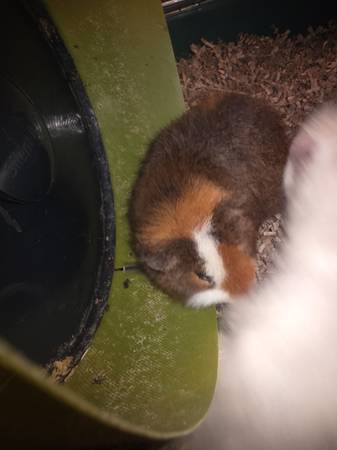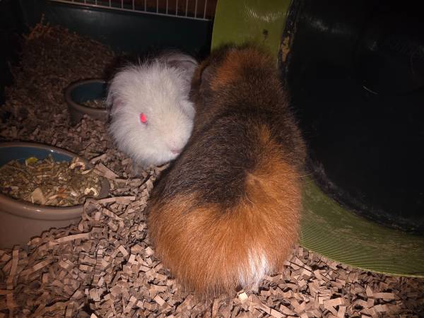2 female 6 month old guinea pigs Lh albino & tri color teddy bear White one is super friendly. Takes treats lives attention. The other one needs to warm up a little but is still friendly