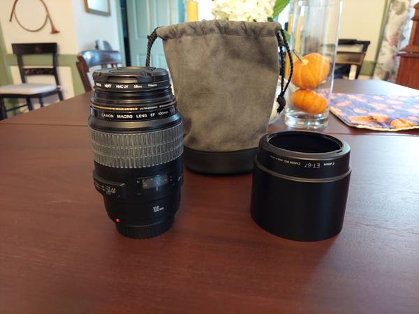 The Canon EF 100 mm f2.8 USM Macro autofocus lens is used but in excellent condition It can be used to take close-up and Macro photography. Included with the lens is a Hoya UV filter, a lens cap, a...