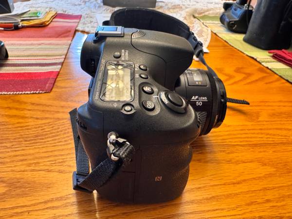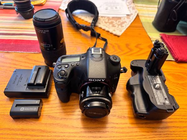 Used Well kept Sony A77 Mark II with Minolta 50mm 1.4 lens, Prospec 75-200 4.5 lens, Grip VG-C77AM and 2 batteries with charger. All working order. Bought a new camera.
