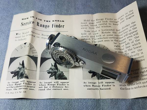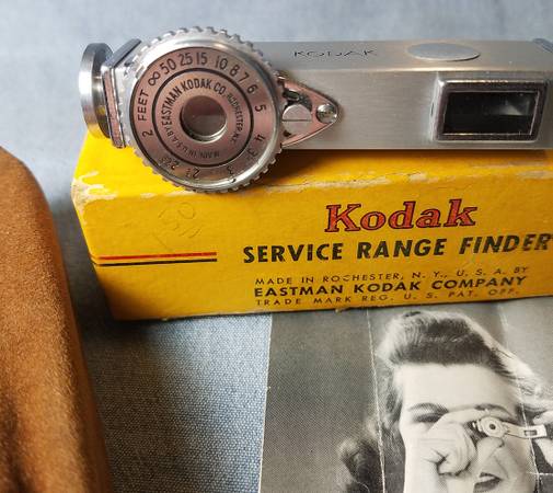 Eastman Kodak Service Rangefinder in original box, suede cover and paperwork. Vintage collectible. This would be placed into a shoe on camera and looked thru, bringing 2 images together, to get the distance so that the lens could be focused sharply. It's call "Service" because it's adapted from the World War 2 military rangefinders. This is circa 1948 to 1952?