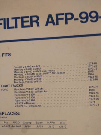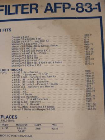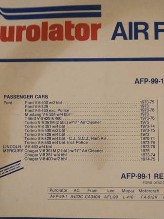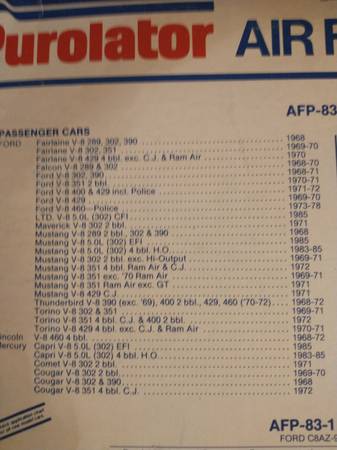 Purolator AFP 99-1 $1 I have 4 Purolator AFP 83-1 $1 They fit 289 302-400 429-460 351 Fords Starting in 1968 Cash pick up only