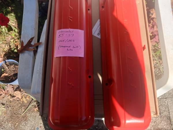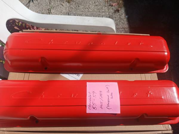 I have 2 pairs of chevy valve covers for 265 or 283 that fit from 1955 through 1959. They have the staggered mounting holes(not straight accross) all are cleaned and painted.