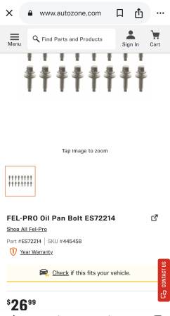 Oil Pan Bolts for Ford 3.0 liter V-6 Engine Fel-Pro EH 72214 ( new in package ) Ford Ranger 1991-2001 And Ford Taurus 1990-2001 $10. Cash and Carry Only