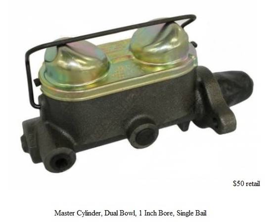 master cylinder, came off of a 10K mile resto -- $20. new stainless steel brake lines, engine compartment only -- $30.