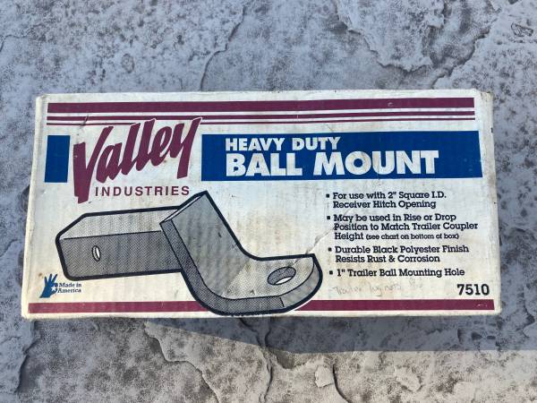 VALLEY INDUSTRIES HEAVY DUTY BALL MOUNT MODEL # 7510 FITS 2" I.D. SQUARE HITCH RECEIVER TRAILER WEIGHT = 5000 LB MAX TONGUE WEIGHT = 500 LB MAX DROP = 2" RISE = 3/4" BALL MOUNTING HOLE = 1" SHANK...
