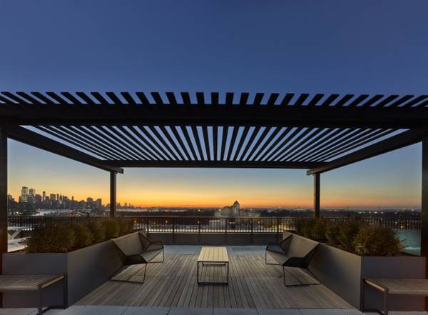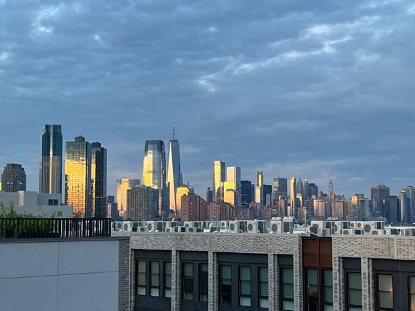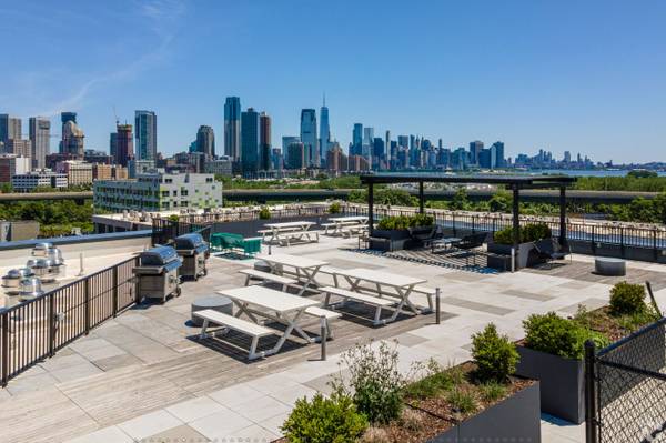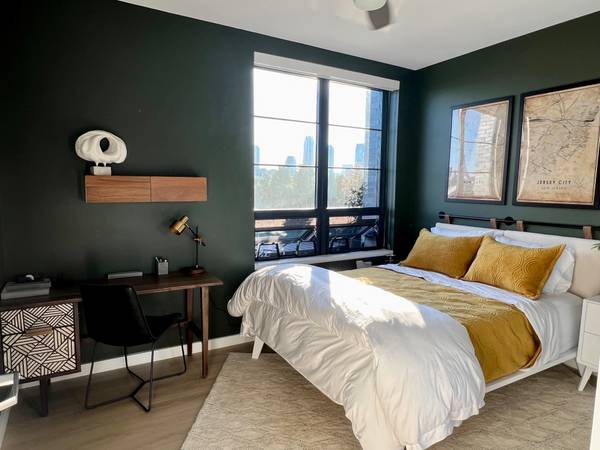 Enjoy the second bedroom and bathroom in a spacious, five-year-old, luxury apartment with an abundance of natural light with stunning views of downtown Manhattan. In-unit features such as washer and dryer & huge private balcony (455-sf)! The property has a gym and co-workspace. Downstairs is a cafe with several new eateries and bars within one block, plus we're located 7 minutes from the light rail offering easy access to Exchange Place PATH, restaurants, bars and shopping.