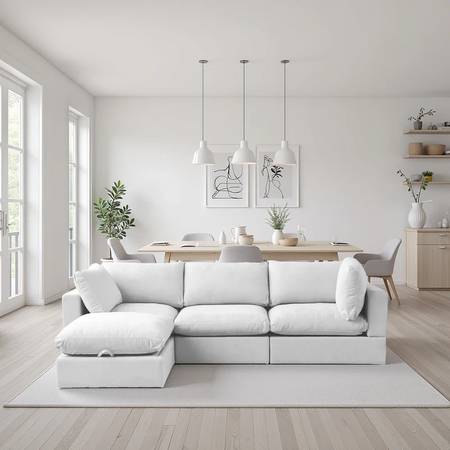 Beautiful fluffy super-comfy sectional sofa pieces with free-roaming ottoman that opens for storage.