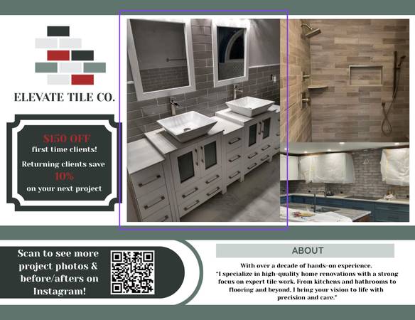 I HAVE OVER 17 YEARS OF EXPERIENCE ON TILE INSTALLATION AND FULL BATH AND KITCHEN REMODELS.ALSO FULL HOUSE REHABS.