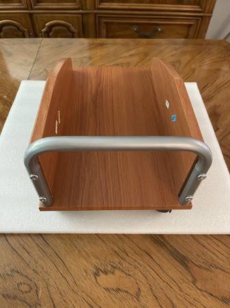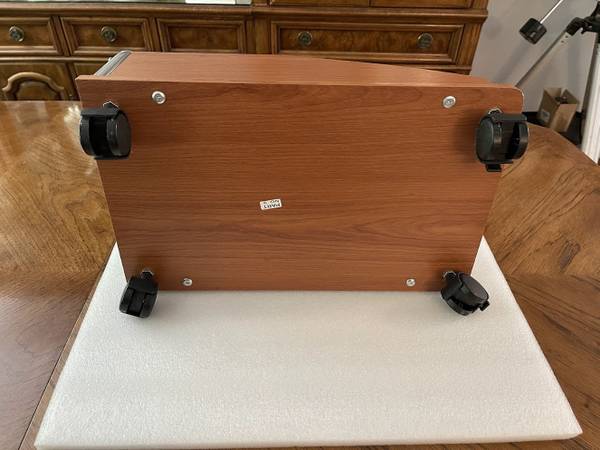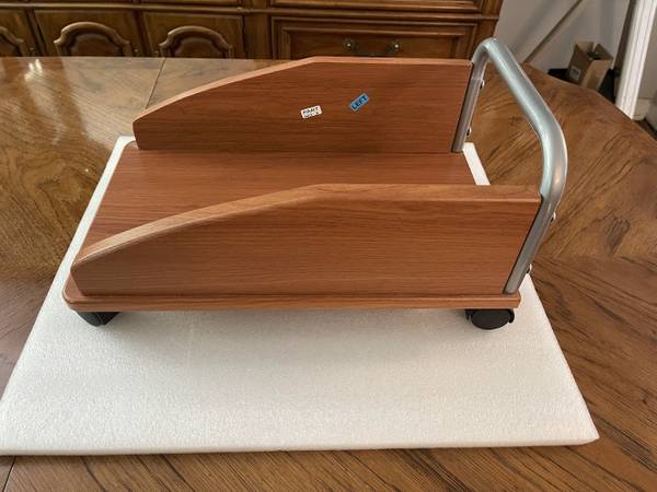Wooden Computer Tower Dolly in Excellent Condition Condition: Excellent Brand: Unknown Size: Measures 8 11/16” across inside the wood panels, 17.25” front to back, 8.75” high to top of metal bar...