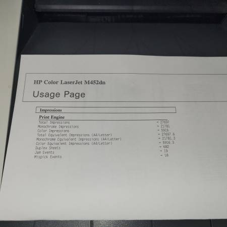 HP Color LaserJet Pro Printer M452dn Network Duplex 27k impression page printed Local Pick Up only from Orangeburg NY 10962 area See photos