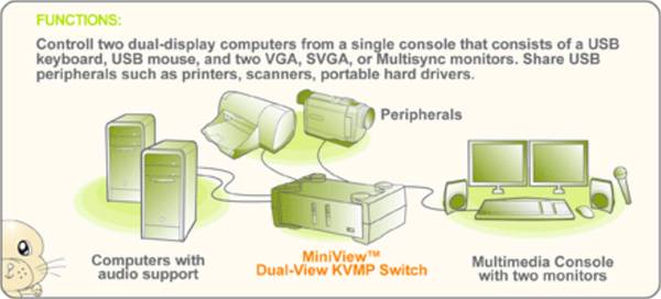 For sale is a used Iogear GCS1742 2 Port Dual View USB KVM Switch and 4 Cables. 2 x Custom audio/video cables as pictured 2 x Custom USB/video cables as pictured With this KVM switch you can operate...
