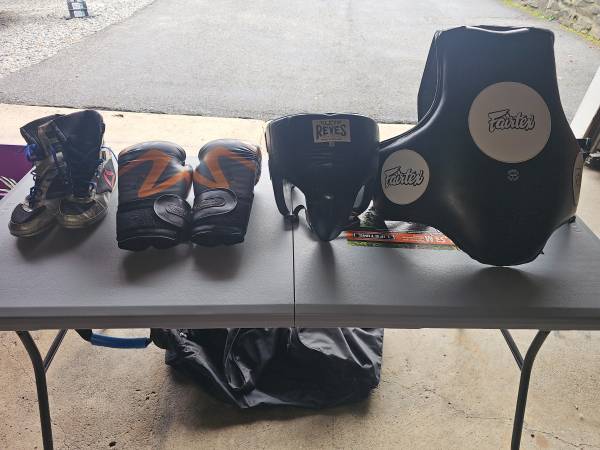 Boxing Gear In Good Condition Fairtex Chest Protector Reyes Groin Protector RDX Boxing Gloves Reebok Shoes Size 9 Large Nike Bag to carry all Asking $30- for all