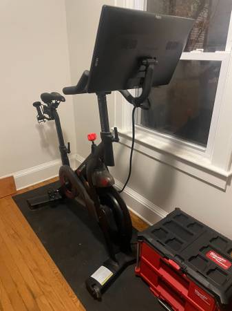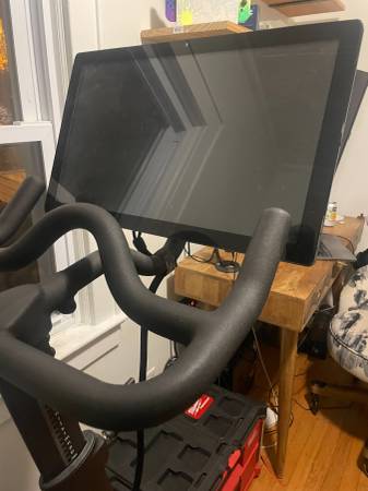 A Peloton stationary exercise bike in good condition. It comes with a pair of 5lb weights and size 8 shoes.