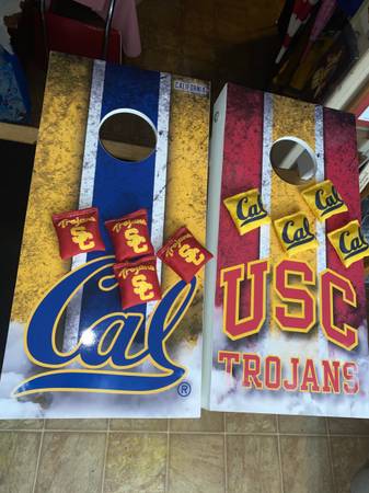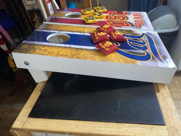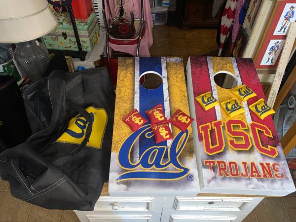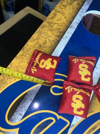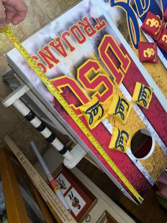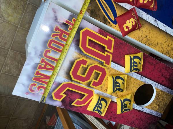 This is an official College Game set of CORNHOLE with Cali Trojans. This comes with 8 bean bags all with the college name on bags and terrific landing board. This is a junior size not official game size and portable with carry bag. Measures 23 1/2 inches high 11 1/2 long and bags are 3 inches. Check all photos and email or text with any questions. Tons of fun outside in a yard or any party or gathering outside.