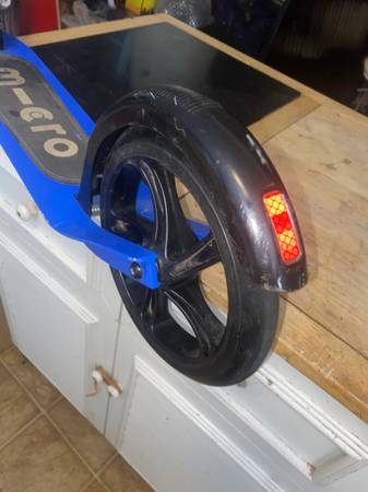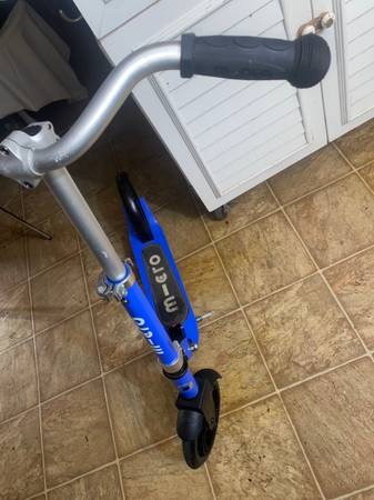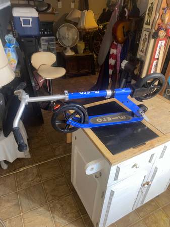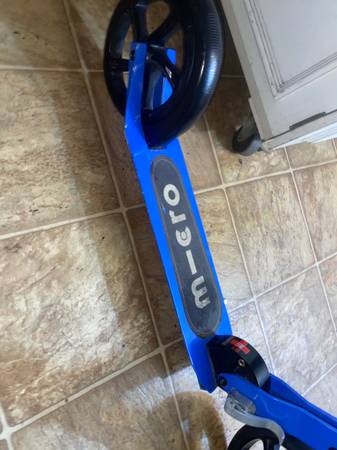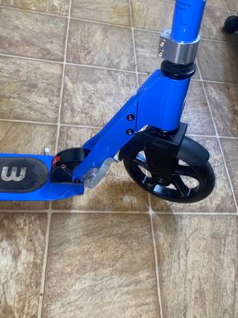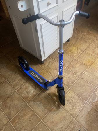 This is in terrific condition Micro Brand Swiss Design adult portable folding scooter. This is only one I can find that has handle bars like a bike design not the normal scooter look. Measures 34 inches long and 32 inches high. The wheels are like new and 8 inches of solid rubber. Has kick put bar to keep scooter up. Folds easily for storage or to bring with you anywhere. It was not used much at all it's in excellent shape all over with just just scales to paint more in front. Even under the scooter is very clean on most of it. Check out all the photos and email or text with any questions.